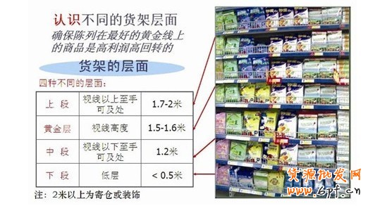 商品陳列 架的高度一般以90至180厘米最為普遍,而顧客胸部至眼睛的高度是最佳陳列處,有人稱此為“黃金空間”。