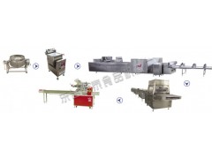 該生產(chǎn)線由熬糖設(shè)備、攪拌機、送料機、鋪料機、拍打機、撒布機、冷卻流泵、自動切塊機、巧克力涂層生產(chǎn)線、包裝機組成,整機采用變頻調(diào)速同步,PLC控制切塊長度,七道輥筒壓平,微電腦控制成型溫度,成型方正良好,切塊長度精確,產(chǎn)品重量一致,整機連續(xù)生產(chǎn),實現(xiàn)了對谷物棒真正全自動智能化作業(yè)。
