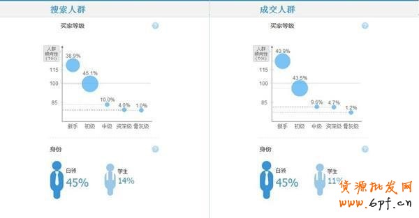 買家等級和人群身份中,新手和初級買家較多,白領和學生占比較大,這個數據印證了上圖的中等水平消費能力。