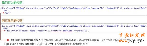 后來(lái)根據(jù)研究。在調(diào)用淘寶的輪播組件>(官方開(kāi)源JS模塊。也就是常用的普通輪播)代碼的時(shí)候,頁(yè)面會(huì)自動(dòng)為組件內(nèi)的代碼,置入一個(gè)position:absolute屬性,這樣說(shuō)很難理解。我們直接上圖說(shuō)明吧!