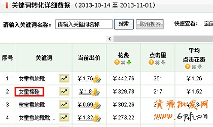通過對(duì)數(shù)據(jù)魔方和直通車魔鏡以及淘寶搜索框關(guān)鍵詞篩選,發(fā)現(xiàn)“雪地靴”相關(guān)詞較多,因此,對(duì)于相關(guān)詞與寶貝屬性進(jìn)行匹配,逐漸完成關(guān)鍵詞的更換與添加。同時(shí),根據(jù)掌柜的推廣費(fèi)用的承受能力。對(duì)于關(guān)鍵詞的出價(jià)及排名每天用智駕寶進(jìn)行卡位等優(yōu)化。該款寶貝直通車帶來流量很轉(zhuǎn)化的關(guān)鍵詞,呈現(xiàn)出遍地開花的局面。