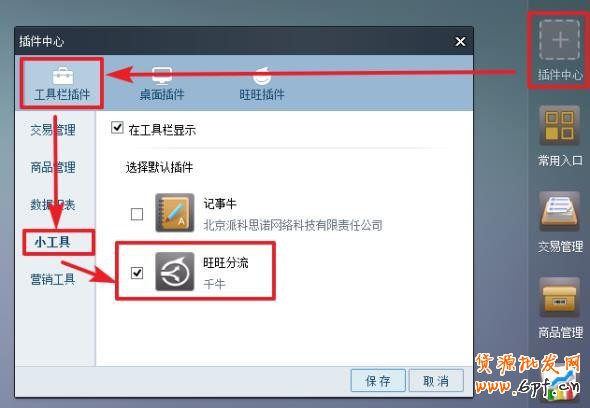 第一步:在千牛PC插件管理中的“工具欄插件”—“小工具”勾選“旺旺分流”插件,如圖: