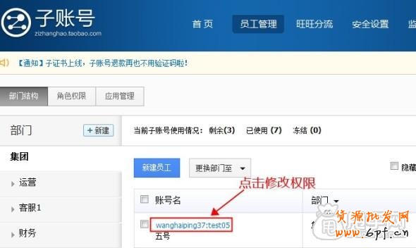 第3.步:進入(員工管理--部門結(jié)構(gòu)),點擊子賬號名稱,進入授權(quán)頁面: