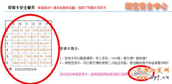2.點擊申請后會需要手機或者數字證書驗證驗證成功后會出現以下界面。左邊是你申請的密???,右下方的立即下載可以將密保卡下載到本機