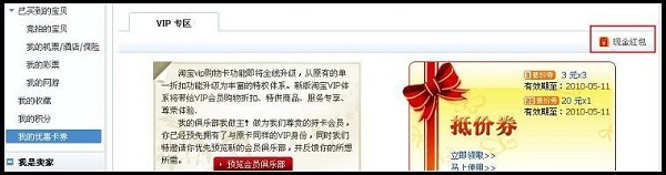 您也可以進入“我的淘寶”—“我是買家”—“我的優惠卡券”頁面點擊VIP卡專區右上角的“現金紅包”進入支付寶紅包管理平臺查看(如圖):