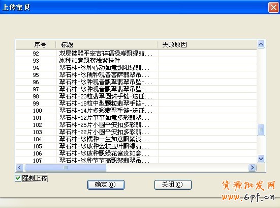 上傳過程中,成功或者失敗以及失敗原因,都會顯示在“失敗原因”一列,親可以知道哪些寶貝上傳成功了,哪些失敗了,為什么會失敗。然后點擊【關閉】按鈕關閉對話框。