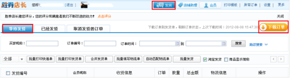 整理發貨單,可進入“勝券店長”,“發貨”頁面進行“下載訂單”,進行更新后,“等待發貨”欄里面查詢當日待處理的訂單。