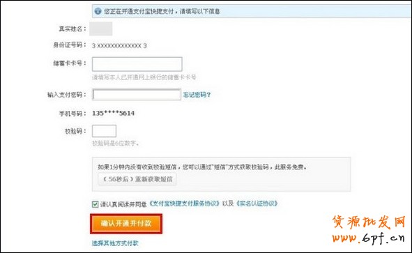 2、需要用戶填寫真實姓名、身份證號碼、儲蓄卡卡號、填寫在銀行預存的手機號碼并輸入校驗碼、支付密碼,閱讀協議,點擊“確認付款”,提示成功并開通儲蓄卡快捷支付。