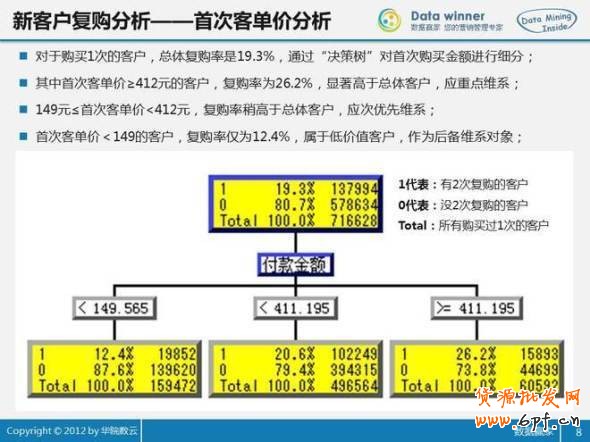 3.對于購買1次的客戶,總體復購率是19.3%,通過“決策樹”對首次購買金額進行細分;