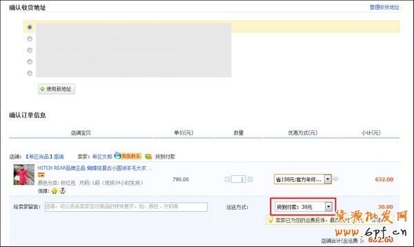購(gòu)買單件商品點(diǎn)擊“立刻購(gòu)買”,選擇“運(yùn)送方式”為貨到付款。買家可以按服務(wù)費(fèi)進(jìn)行相應(yīng)的選擇。