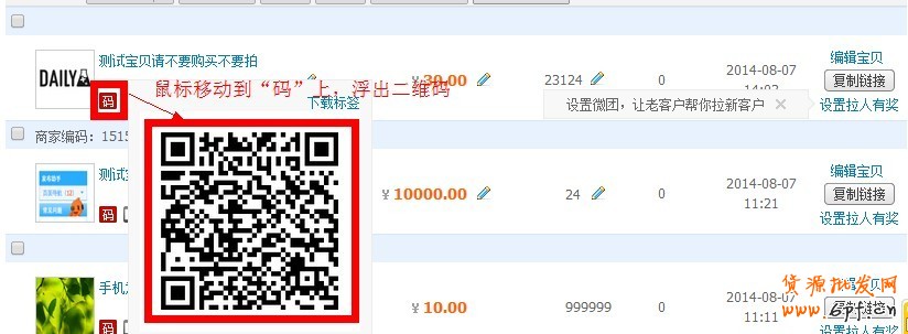 2、鼠標移動到單個商品下的“碼”字標簽上,浮現出二維碼