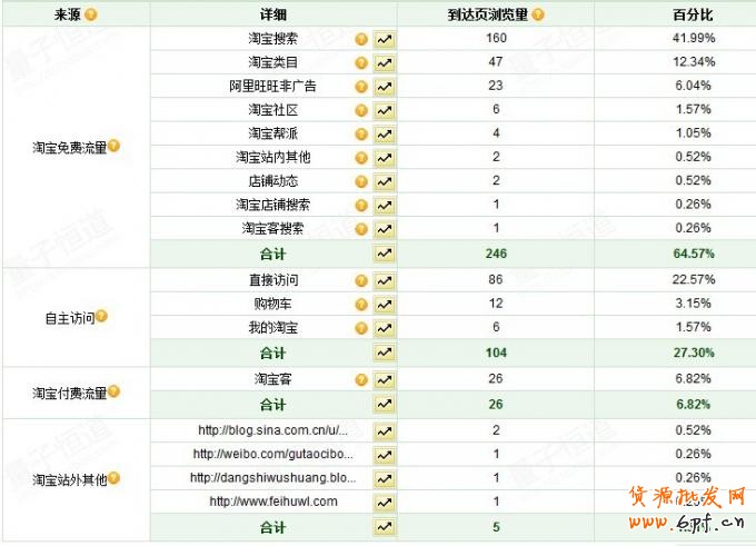 點擊上圖最左邊圖片中的推廣效果,有一個流量來源構成,我們可以通過來源過程來看自己做的推廣哪些有效果,哪些需要強化。看下面的參考圖: