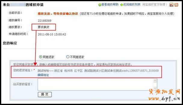 點擊頁面上的“同意退款”來同意維權協議 ,若賣家設置過退貨地址,系統會默認選擇,若未設置,可以直接填寫。同意給買家換貨后,系統會給予雙方10天的時間進行換貨或者維修的處理,超時這個時間買家沒有撤銷維權,淘寶客服會在2個工作日內介入處理。