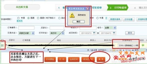所有的信息備注確認完畢之后,點擊買家信息最左邊的方框進行打鉤選擇,然后再點擊保存修改信息,方能進行打印,如果不保存,系統提示不能操作打印。個人認為此處比批量打印操作稍顯麻煩。