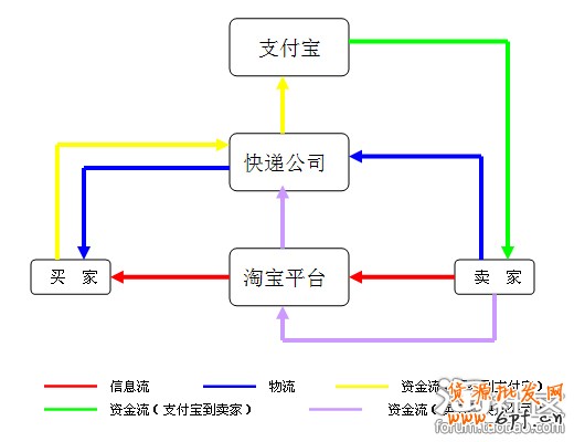 紫色部分表示賣家到快遞公司的資金流,在支付寶交易的情況下,快遞公司是賣家自己去找,現在貨到付款時淘寶簽約快遞公司,所以賣家對快遞公司的資金流是通過淘寶(或支付寶)來完成對快遞費用的支付。