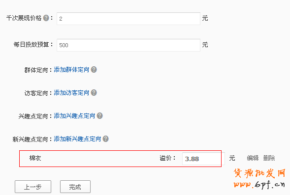 你是做什么的用哪個類型的興趣點,比如雪紡衫 中老年裝 褲子,測試的時候單個興趣點設定一個計劃,在測試階段不要怕麻煩,每個計劃出一樣的價格,看哪個興趣點點擊率最好最適合自己。再進行投放。如圖: