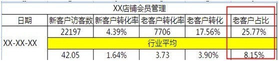 通常運營者還會將這張表格里的數據記錄在EXCEL里,去測算比對行業之間的另一項數據—老客戶占比構成。
