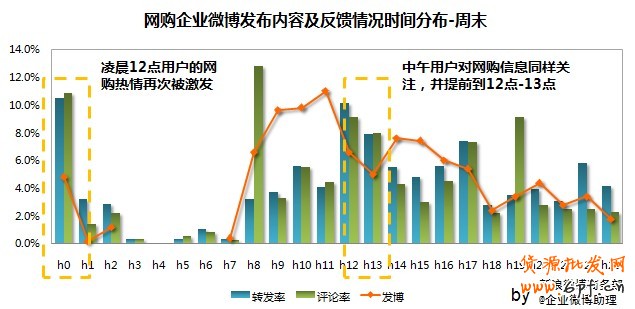 周末的11點之后仍是用戶積極互動的時間:由于周末休息較晚,11點之后企業微博仍然可以獲得較多的用戶反饋。