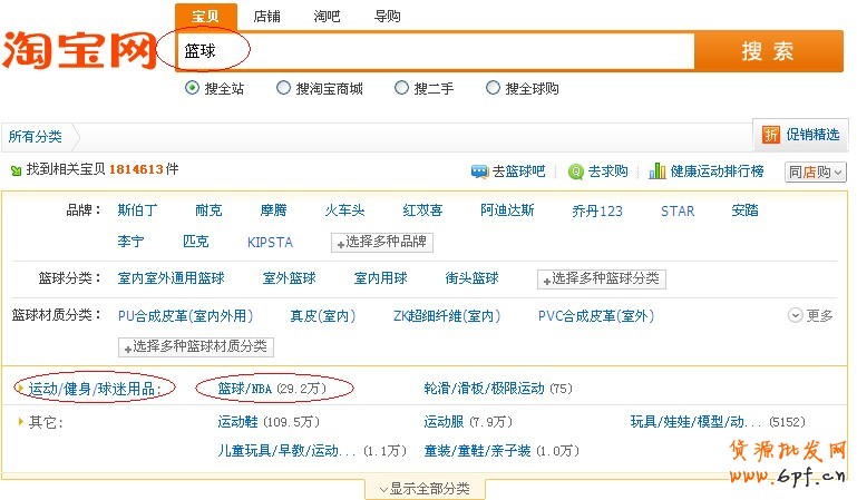 可以看到,“運動/健身/球迷用品”中的“籃球/NBA”中的寶貝會被優先展示,排名靠前的都是籃球。而其他類目中的包含“籃球”字眼的籃球鞋丶籃球服等排名都會很靠后。