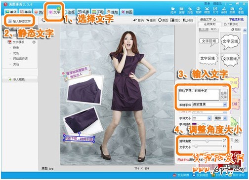 第四步:然后在會話氣泡中添加圖片細節圖的文字注釋。操作就選擇"文字/輸入靜態文字",在文本框輸入文字即可。當然也是需要調整文字的大小以及適當的角度了。