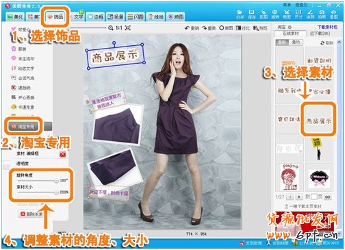 第五步:覺得設計還不夠的,還想添加些自己喜歡的特色素材,就繼續選擇"飾品/淘寶專用",選擇合適的素材,直接點擊即能生成在圖片上。