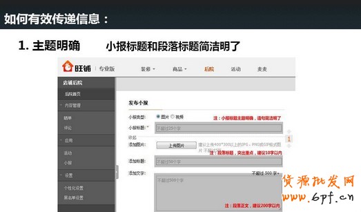 小報也一樣,需要主題明確,買家點擊進你的小報,你在第一秒想傳遞給買家什么信息?小報標題一定要做到簡潔明了,讓買家一眼就能獲取信息,每一段文字的標題也一樣,不要讓買家費力的去讀,否則很難有效吸引買家并傳遞信息。