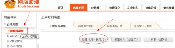 工具吧網(wǎng)店助理有一個叫上架時間調(diào)整的功能,我們點開上架時間調(diào)整后,最好是點擊新建計劃(按分類)。如下圖: