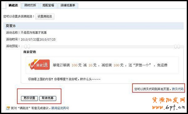5、已經設置好的活動,可操作更改或取消,同時也可將相關設置的代碼復制到其它頁面進行促銷。同時,進入商品詳情頁面就可以顯示具體滿就送活動內容了。