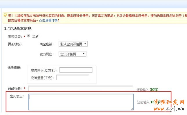 如上圖紅色框所示,“我要賣”商品發布后臺“商品標題”下方填寫寶貝賣點