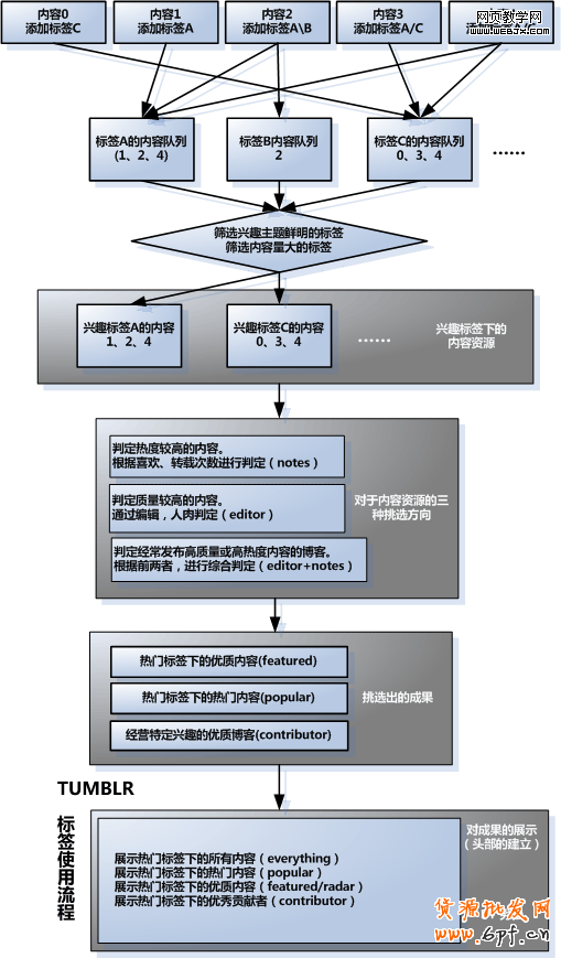 最后說一下TAG在輕博客的作用,TUMBLR將整個社區中極其重要的兩件事情全交給TAG:一是內容索引;二是興趣推薦,并且做到了極致。TUMBLR中的everything(搜索TAG時出現)、popular、featured、contirbutor、radar以及editor,全都依賴于TAG,整齊劃一、自成體系、值得學習。