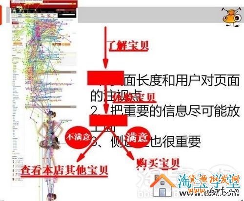 左面是淘寶官方總結的客戶在寶貝頁面的瀏覽習慣與注意力分布圖。賣家頁面內容的布局如果太凌亂沒有章法,不妨用箭頭做一些引導的提示,是不是更清晰,增加買家的體驗呢。具體某個局部,這也是個很好的方法哦,有圖有真相: