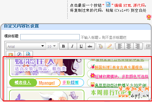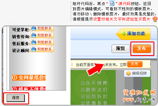 源代碼”按鈕,返回到圖片編輯模式,可以看到不規(guī)則的模板圖片,請勿移動(dòng)\刪除模板圖片,最終效果是完整的,請根據(jù)模板中的提示設(shè)置好相關(guān)的文字和添加寶貝圖片。