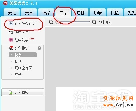 步驟二:為該圖添加您想要的文字說明 和文字導(dǎo)航,點擊美圖秀秀上面的文字按鈕,點擊左側(cè)的輸入靜態(tài)文字