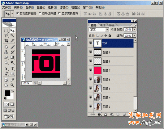 4.F7調出圖層調板,我們得到了一個多張照片重疊在以前的多圖層文件。PS:設計制作動態網店店標,主要就是配合圖層使用PS捆綁的軟件ImageReady完成的。因此圖層調板的使用就是核心技巧。
