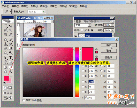 5.調整拾色器,選擇桃紅色后,填充上步我們建立的空白圖層。