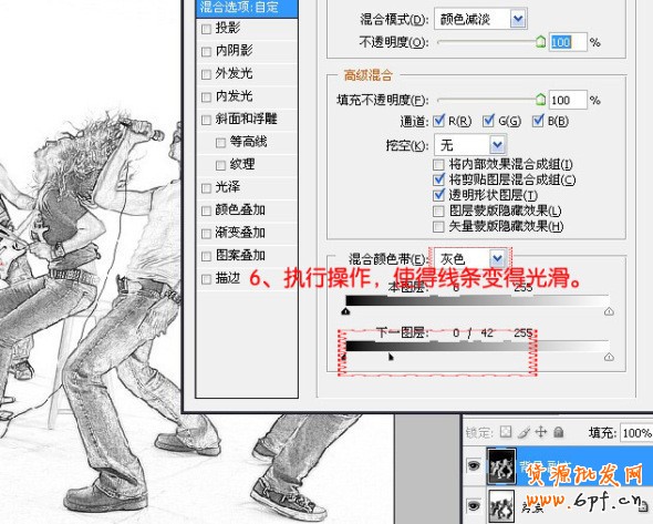 步驟六,點擊圖層面板下面的圖層樣式按鈕,添加圖層樣式選擇“混合選項”,選擇混合顏色帶中的灰色,按住ALT,用鼠標拖動到下一層的深色滑塊的右半到合適位置。這樣做的目的是,整體移動下一圖層的深色滑塊,可以使得下一圖層位于滑塊左側的灰度顯現出來。現在是分離下一圖層的深色滑塊,則下一圖層位于兩個半滑塊之間的灰度就會呈現半透明,其效果就是使得線條變得光滑