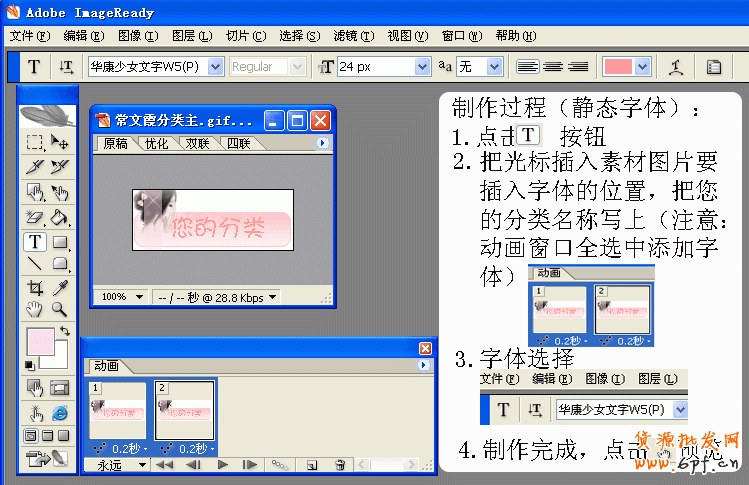 運用PhotoShop或者ImageReady進行添加字體(區別:處理靜態圖使用PhotoShop,處理動態圖使用ImageReady)。