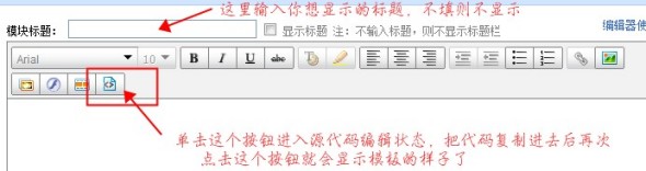 首先解釋一下這個標題,一個模塊就是一個單獨的個體,每個模塊上面都可以有標題,我們可以自定義成“本店熱賣”、“特價促銷”等等這些標題,標題填好了記得勾選后面的復選框,否則也是不顯示的哦。當然你嫌有個標題不好看的話就不用管它了,然后點擊下面框框里面的源代碼標識進入代碼編輯狀態