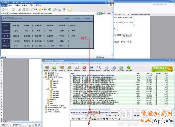 6. 打開淘寶助理,用瀏覽器打開我們的導航條文件,將里面的內容粘貼到“出售中的寶貝”或者“線上倉庫中的寶貝”中的任意一款寶貝的前面,保存,然后點擊“圖片搬家“。