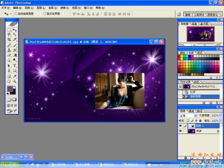 把人物圖片拖到左下角適當(dāng)位置,再利用“自由變換”(Ctrl+T)把人物方向水平調(diào)換一下。