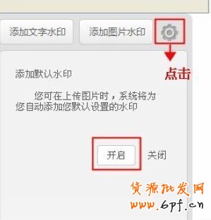第三步:選擇您設置的水印后,添加默認水印設置,點擊“開啟”,您以后上傳圖片會系統(tǒng)會默認您設置的水印。見下圖:
