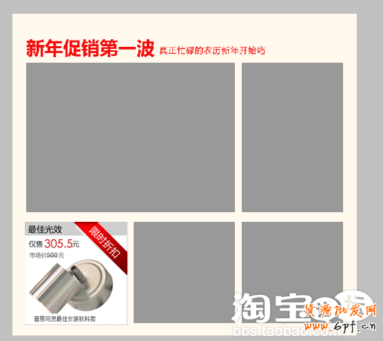 我們這個實例,我的計劃是做一個主題為“新年促銷第一波”的版面,選擇比較合適做促銷又與供貨商談好了供貨價的五款產品。定好了產品和主題,下面的步驟就是怎樣將這些主題文字和產品分好主次進行排列,我們要學習的這個絕招其中最大的一部分就是學會怎樣用PS排列圖片。