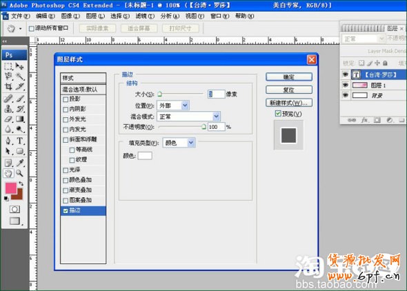 5.【窗口】——【圖層】——選中文字圖層。【添加圖層樣式】——【描邊】——選白色,點擊確定。設置參數,大小:3像素,位置:外部,混合模式:正常。點確定。