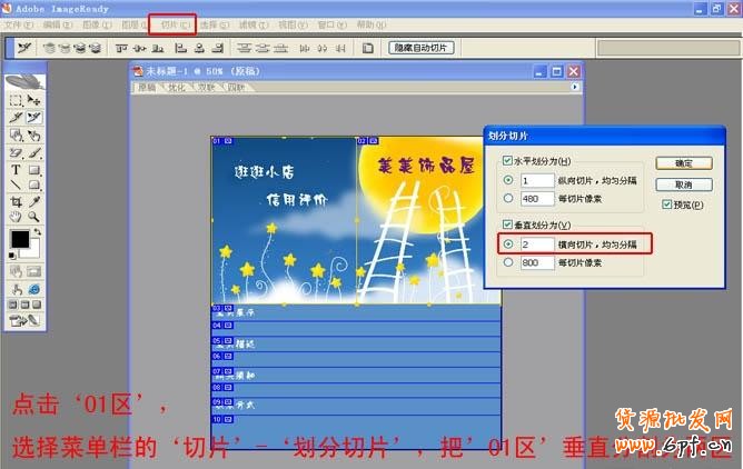 第一,雖然photoshop也有切片工具,但往往要切割得很準(zhǔn)確圖片才不裂開(kāi),如使用ImageReady來(lái)切片就不會(huì)有這樣的困擾了。在模版圖片打開(kāi)的狀態(tài)下,切換ImageReady進(jìn)行切片處理;