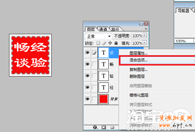 第八步:用鼠標(biāo)在圖層面板中點(diǎn)擊“談”所在圖層,此時(shí)在這個(gè)圖層左側(cè)有一個(gè)毛筆,表明此圖層是當(dāng)前圖層。在該圖層上,單擊鼠標(biāo)右鍵,彈出如圖所示菜單