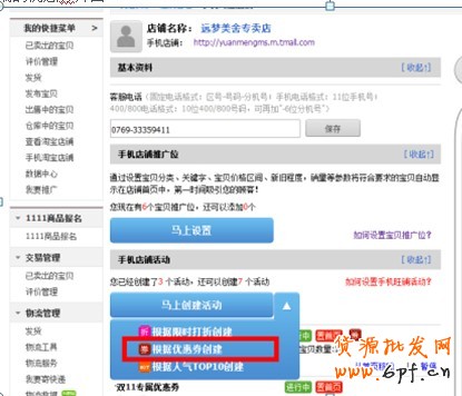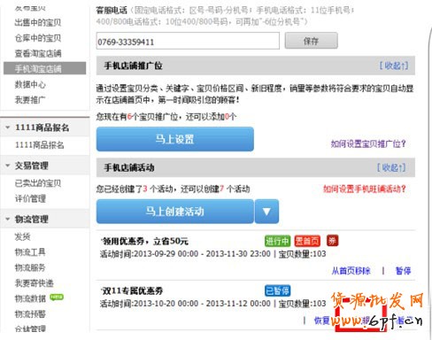 第三步:點擊店鋪后臺左側導航中的【手機淘寶店鋪】,再選擇【手機店鋪基礎功能設置】里面的【設置店鋪營銷活動】