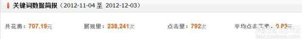 B、開起直通車。直通車讓許多賣家又愛又恨,小學(xué)生也是一樣的感覺,開嘛,本來訂單跟利潤又不大,開了鐵定坑爹,虧本!不開嘛,又沒有流量,買家在漫漫商品海中無法關(guān)注你!痛定思痛之下,還是開起了!剛開的第一天,因?yàn)樵O(shè)置不當(dāng),一個(gè)小時(shí)一百塊就燒沒了,一單也沒有成交,大呼坑爹,傷不起啊!后來玩命的論壇找帖子學(xué)習(xí),最終定下了廣撒網(wǎng),撈小魚的直通車策略:即全店鋪所有產(chǎn)品投滿200個(gè)關(guān)鍵詞,所有關(guān)鍵詞出價(jià)都很低,這樣你在花費(fèi)不大的前提下,也能獲得不錯(cuò)的流量,下面是我這一個(gè)月的直通車花費(fèi)圖,點(diǎn)擊量雖然不高,但是轉(zhuǎn)化率不錯(cuò),點(diǎn)擊進(jìn)來的肯買,一個(gè)可能是我的產(chǎn)品定價(jià)跟定位不錯(cuò),另一個(gè)也可能是買家翻到后面了,懶得再找