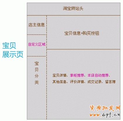 圖中除了寶貝展示頁的掌柜推薦、自動推薦,粉色字體所顯示的店招、自定義區域都是可裝修的地方。