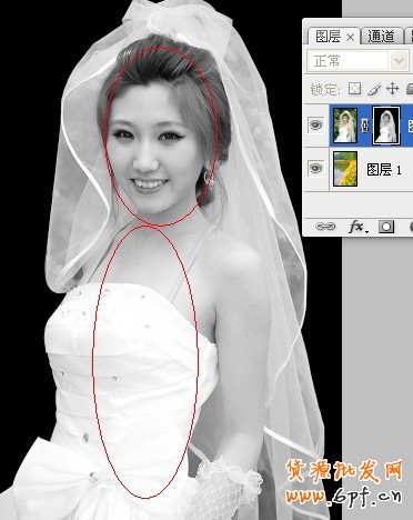 回到圖層,在圖層下面加一個背景來觀察:發現什么了?我們只摳出了透明部分,也就是紗的部分,而人物被蒙版給透明了。