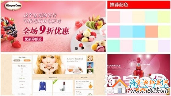 各種顯眼的顏色加入白色后,便會調和出很多柔和的粉色,常見的有粉紅、粉黃、粉藍等等。這些顏色往往會給消費者一種清爽、浪漫、嬌美、舒適的感覺。以清新粉為例,配色時建議搭配黑色、白色以及各種粉色。
